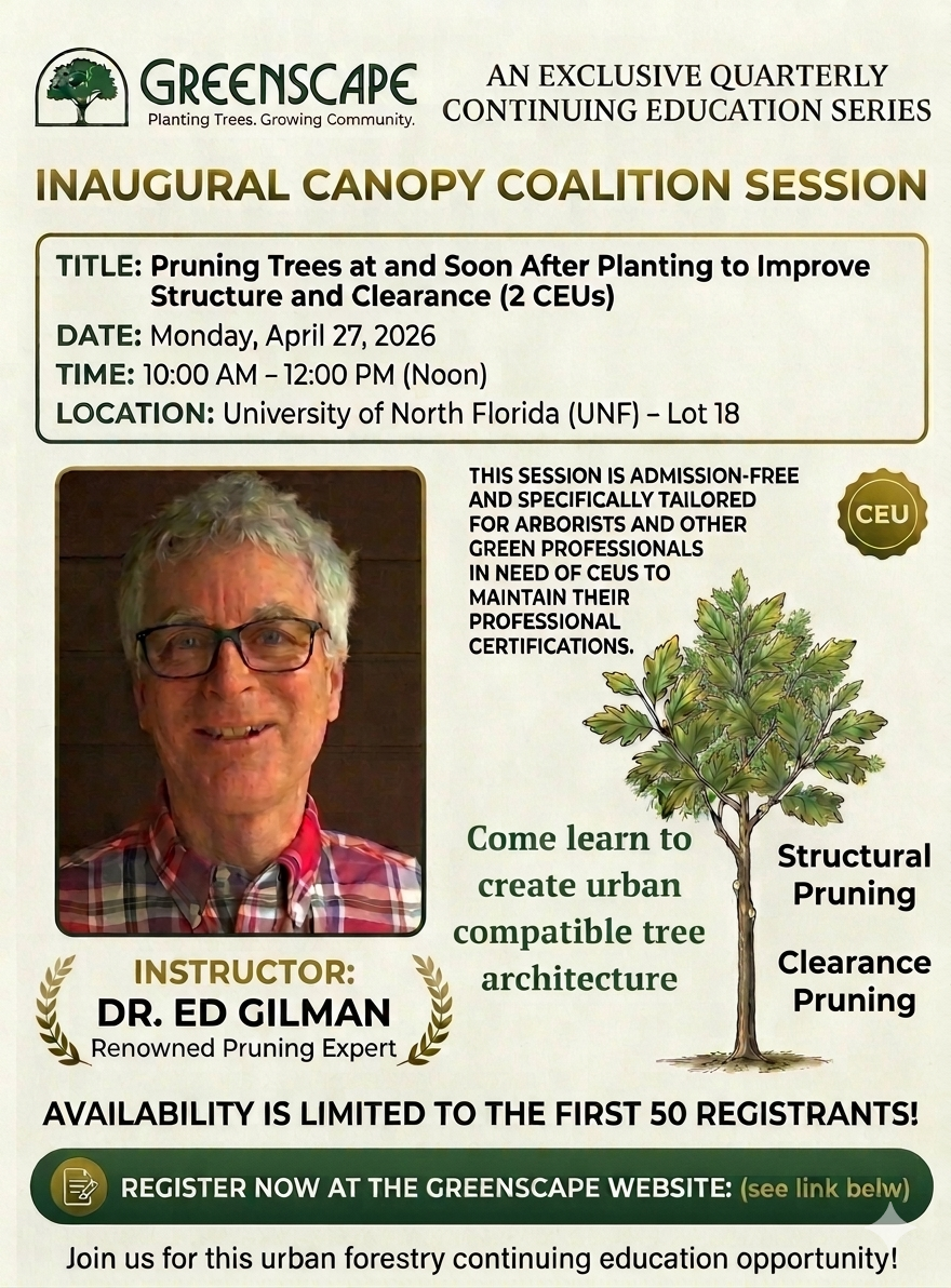 Greenscape is the City of Jacksonville’s official Arbor Day host, and we hold the Great Tree Giveaway each fall in celebration. Thousands of trees are given away to the public to help increase trees on private property.