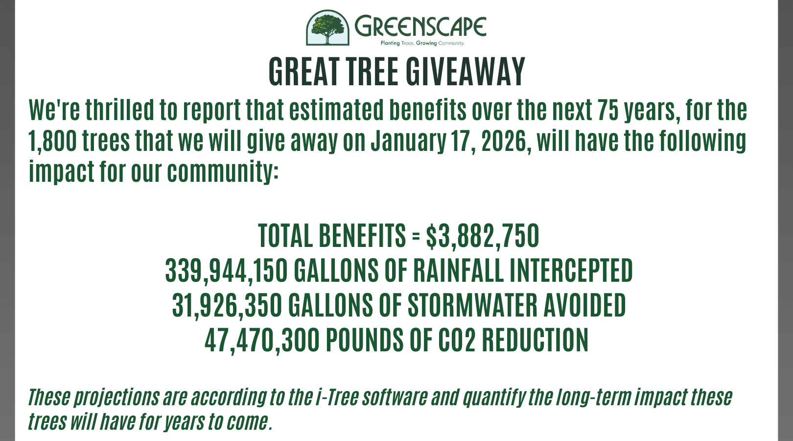 Greenscape is the City of Jacksonville’s official Arbor Day host, and we hold the Great Tree Giveaway each fall in celebration. Thousands of trees are given away to the public to help increase trees on private property.